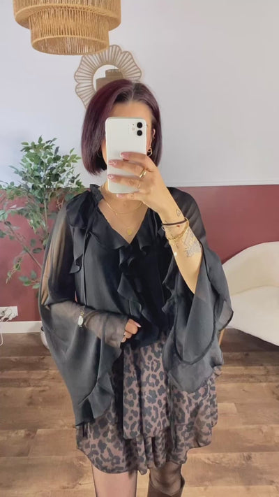 Le modèle mesure 1m57 et porte la taille S